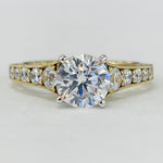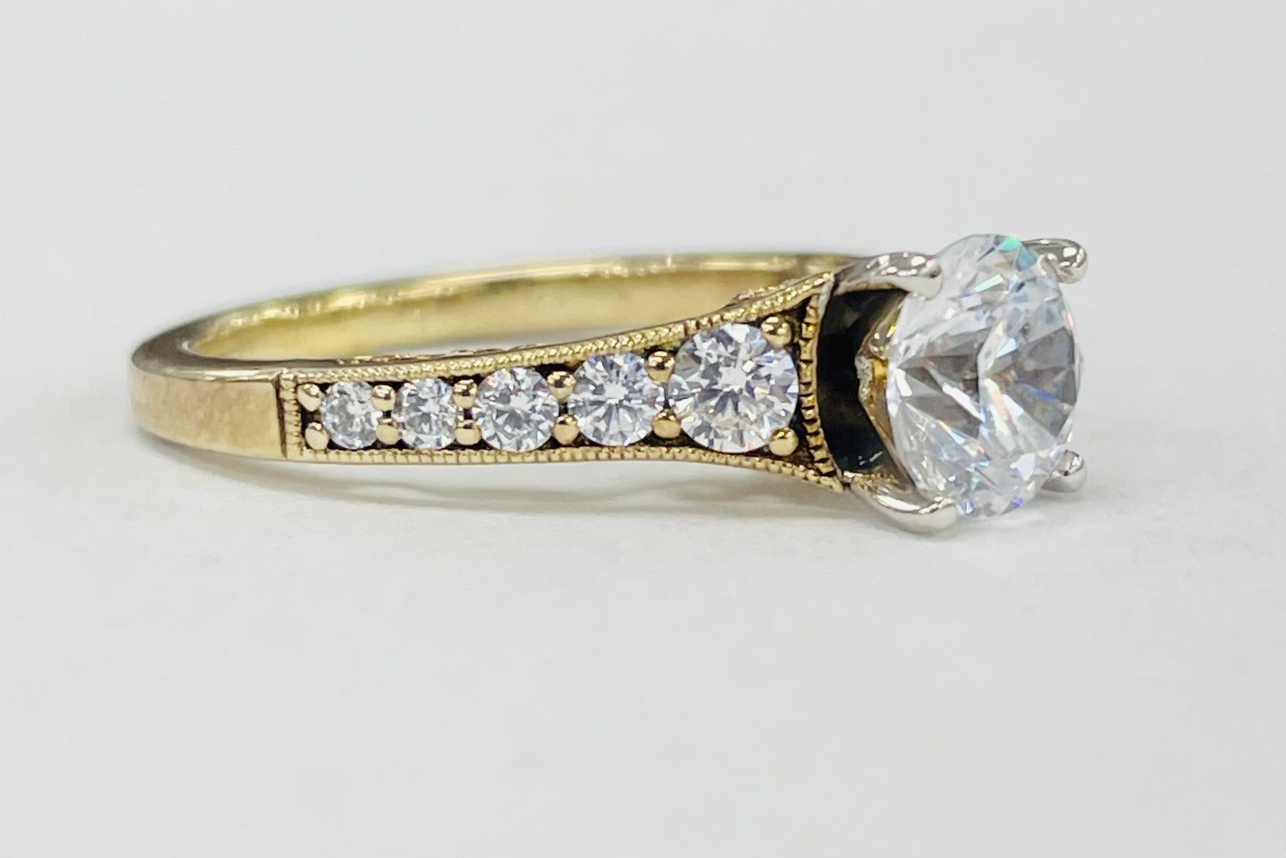 A beautiful yellow gold simple setting. Featuring a graduated diamond cathedral style setting with milgrain. Accented by a beautiful open fillagree undercarriage.