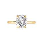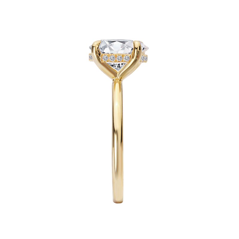 This 14kt yellow gold semi-mount engagement ring has a hidden halo of diamonds underneath a center setting that will accommodate a 10x7mm oval shaped diamond. (D .06 carat total weight)