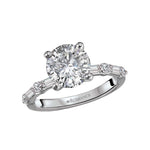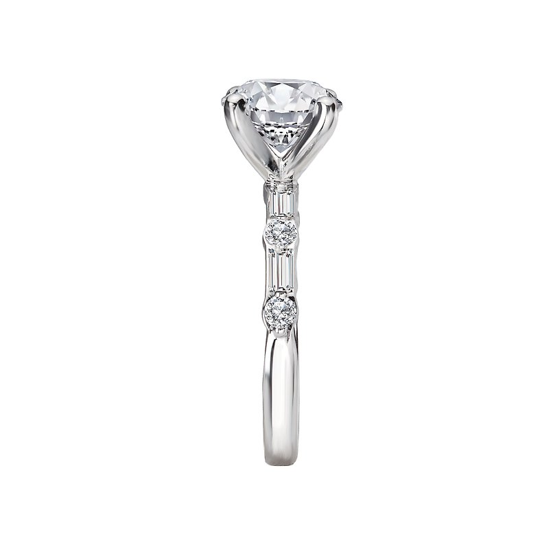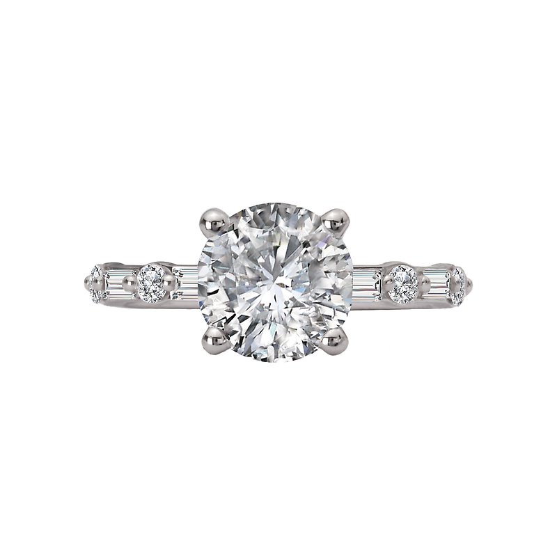 14kt white gold engagement ring with alternating baguette and round diamonds along the shank on either side of a center setting that will accommodate an 8.2mm round diamond. (D 1/3 carat total weight)