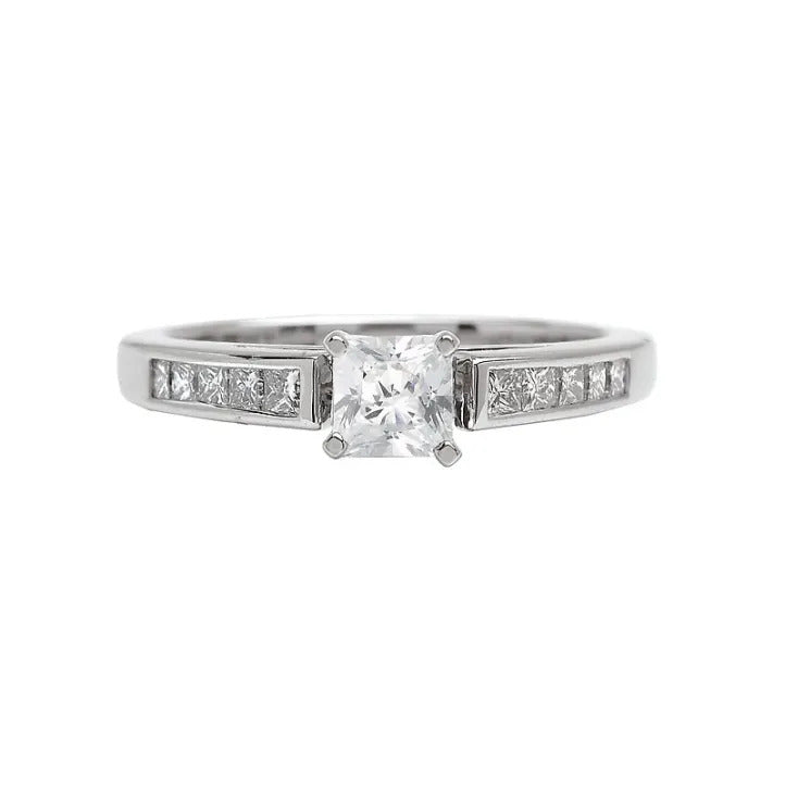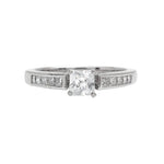 Channel Set Diamond Ring is crafted in high polished 14kt White Gold with a peg head center. (D 5/8 carat total weight) This peg head semi-mount ring comes with NO CENTER STONE as shown but it will accommodate a 5.5mm princess cut center stone.