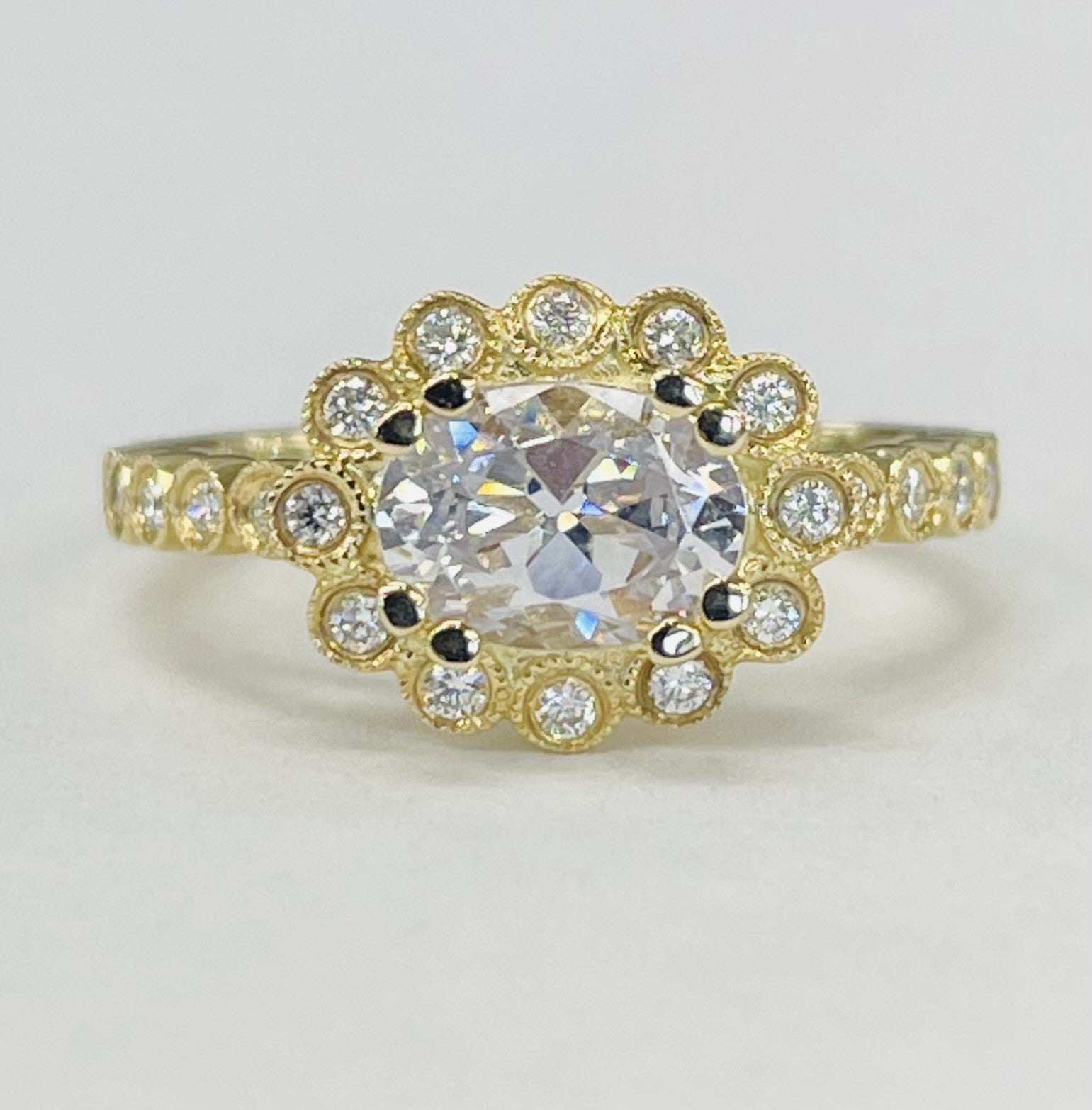 A sculpted oval setting framed by 24 points of sparkle — crafted for timeless love.
