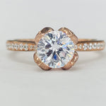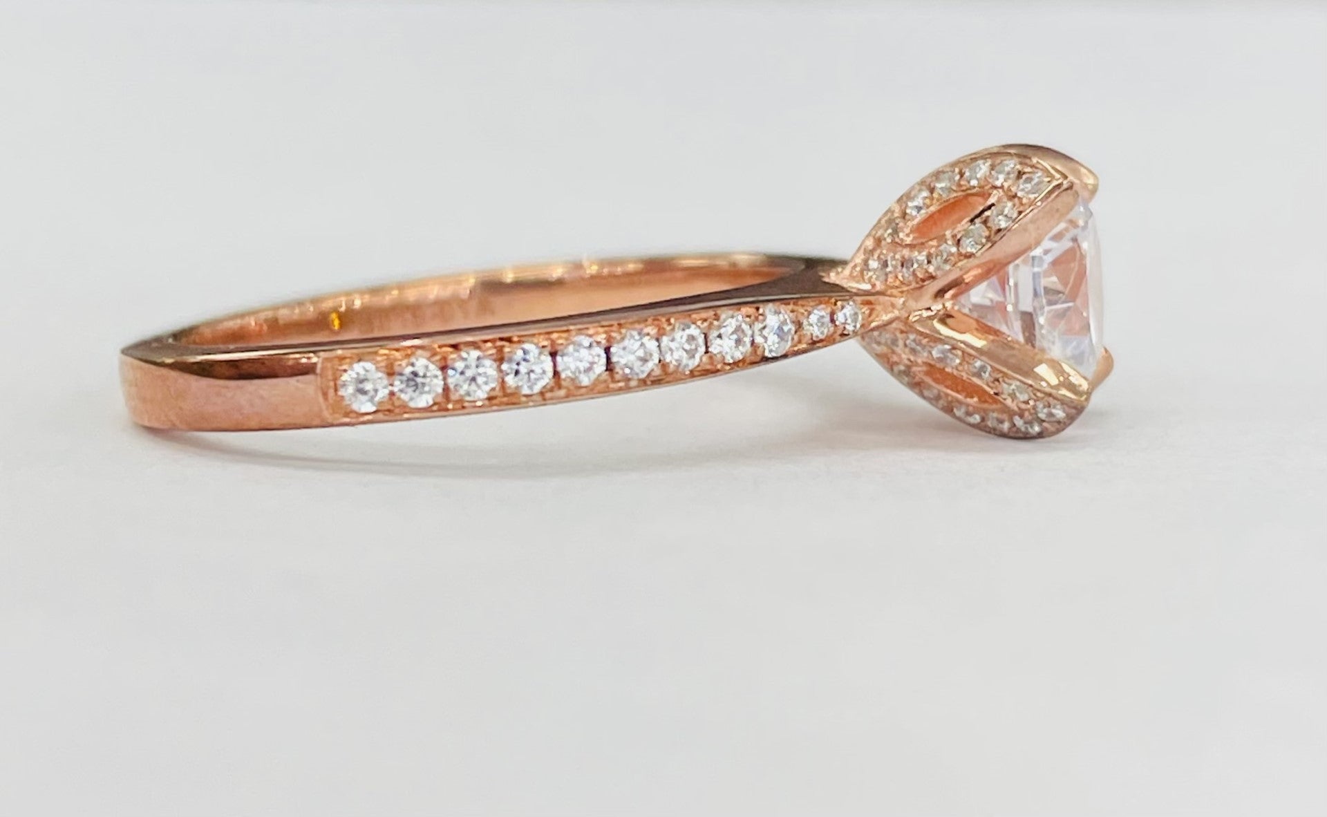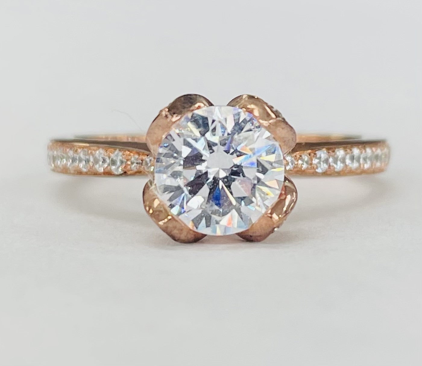A elegant setting with a hint of floral design. Made out of rose gold this setting features a four petal head to hold your center stone. Accented by diamonds all around the petal head and diamonds down the sides. A breathtaking ring for any nature lover.