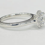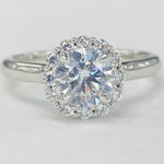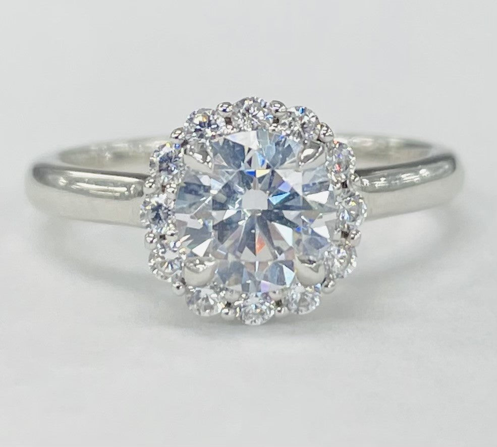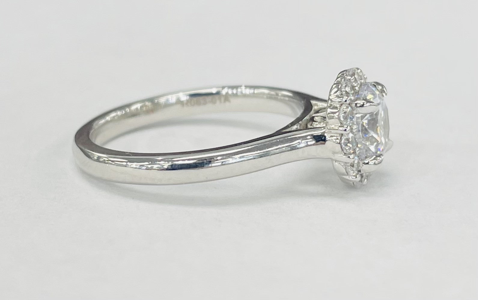 A modern halo with a floral feel. Made out of white gold this ring features a modern floral style halo with breathtaking round brilliant white diamonds. Accented by a plain high polish shank to add contrast.
