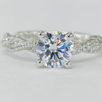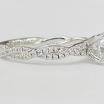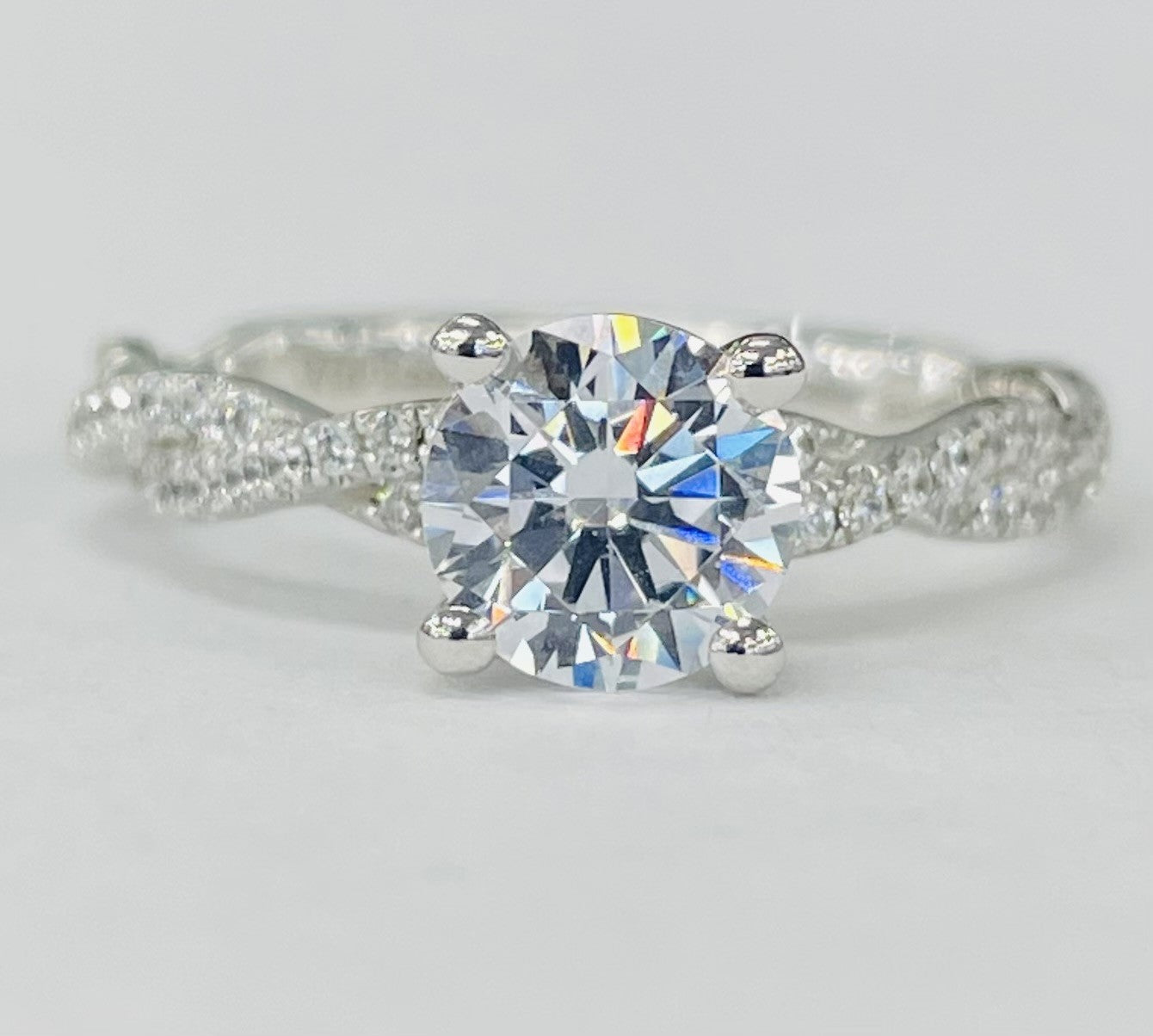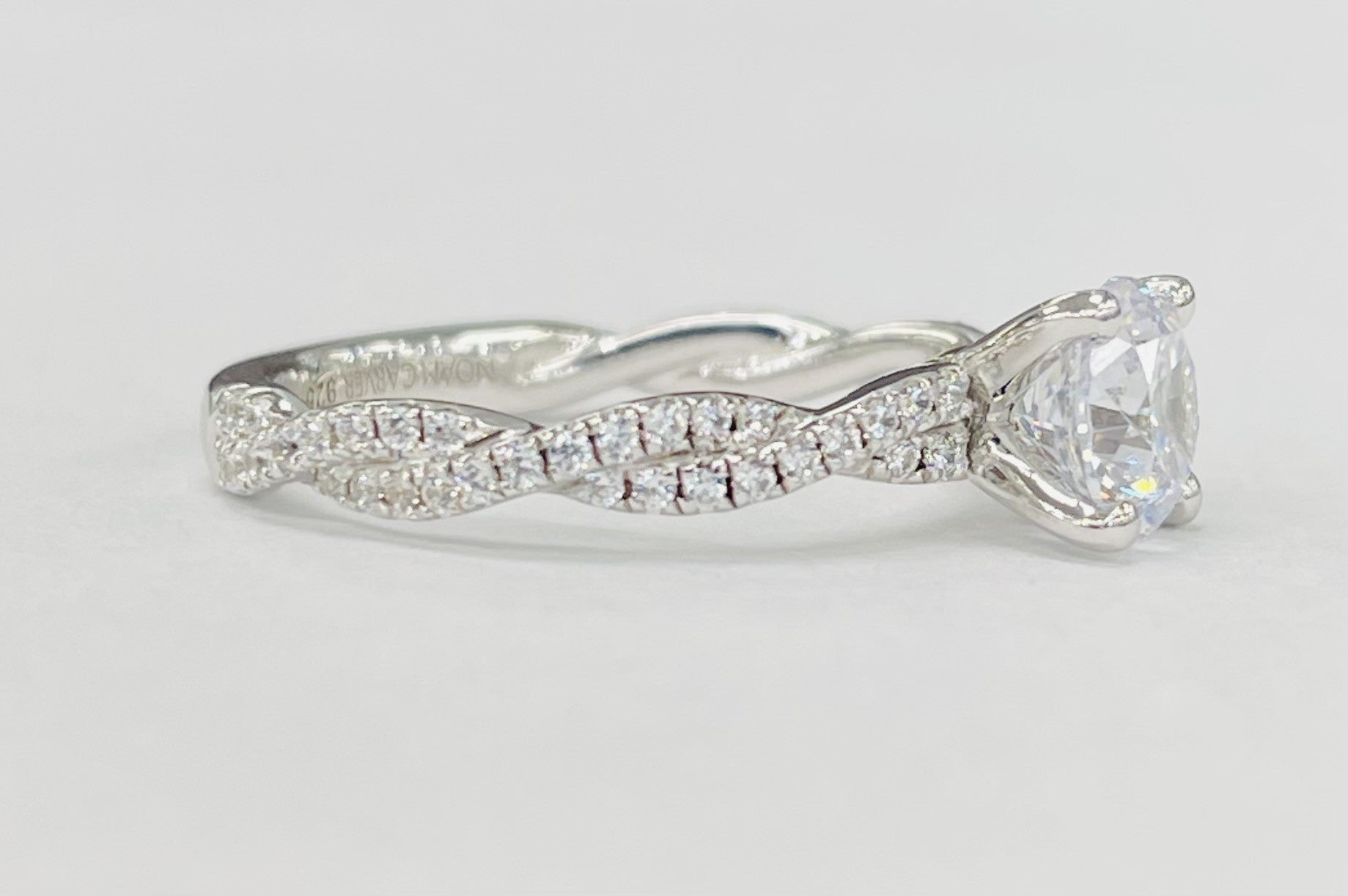 A simple setting with some bling. This ring is made out of white gold with a tight twisting setting accented by stunning round brilliant diamonds.