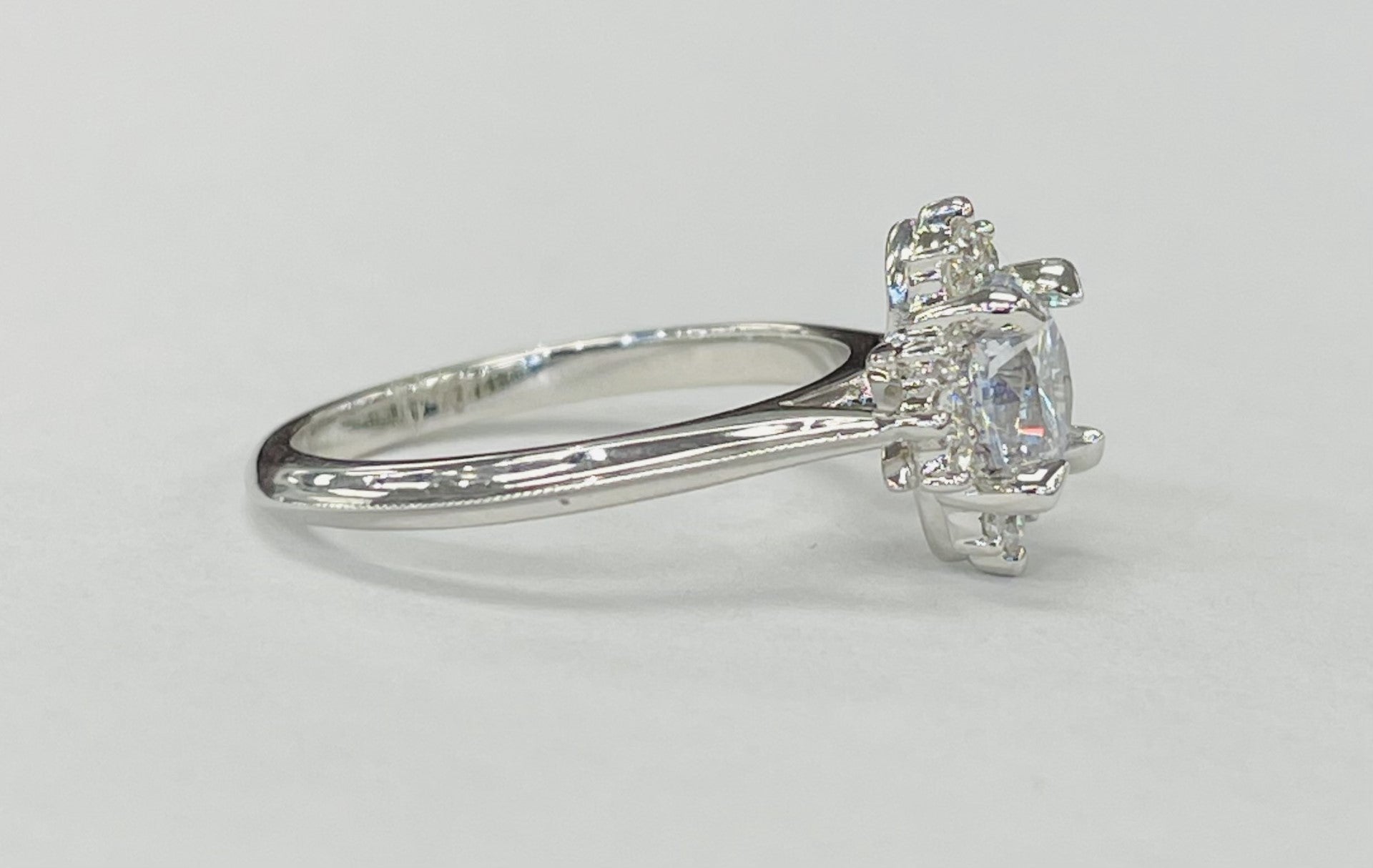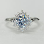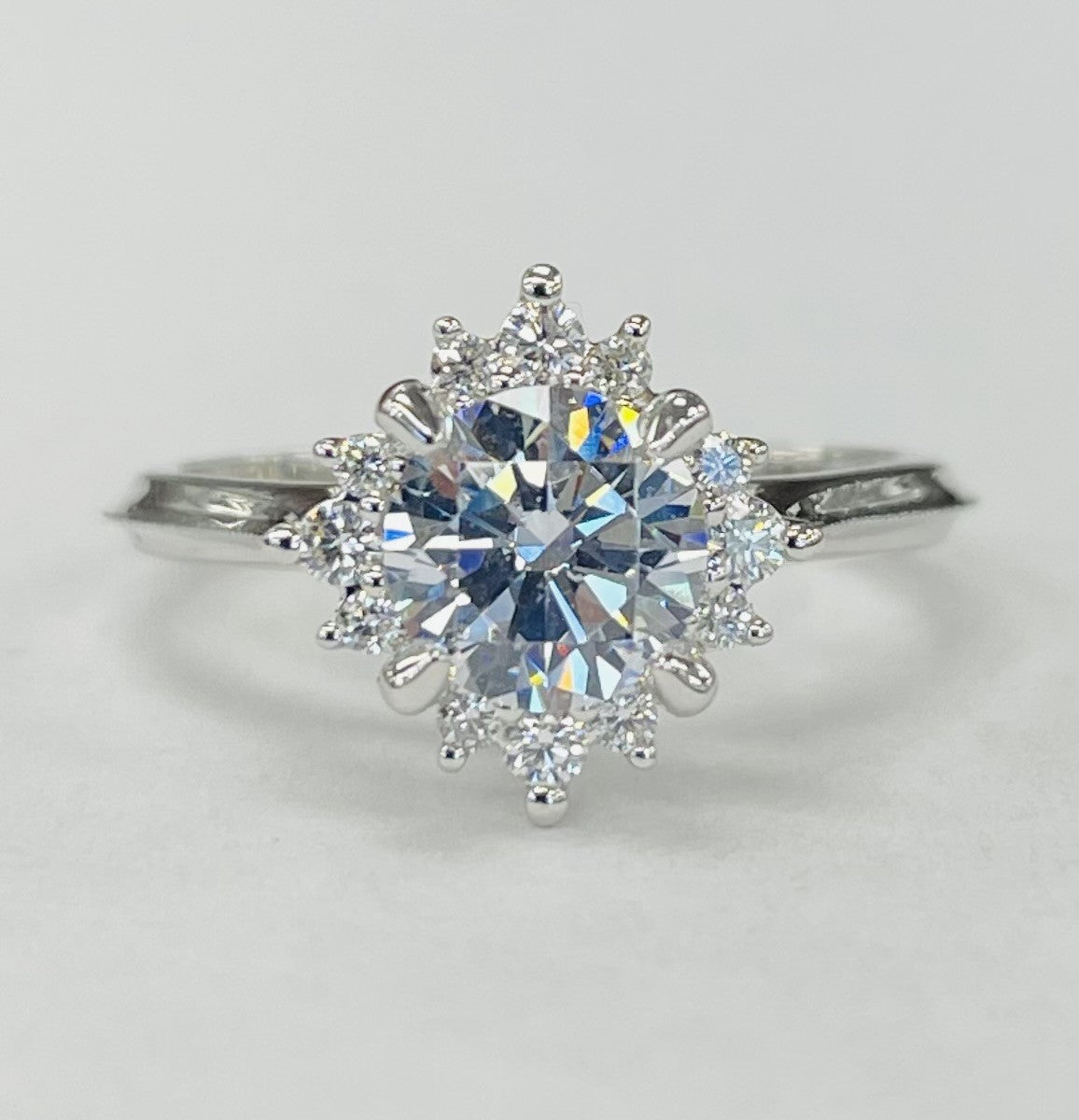 • Design: Starburst halo with floral-inspired engraving and milgrain edges