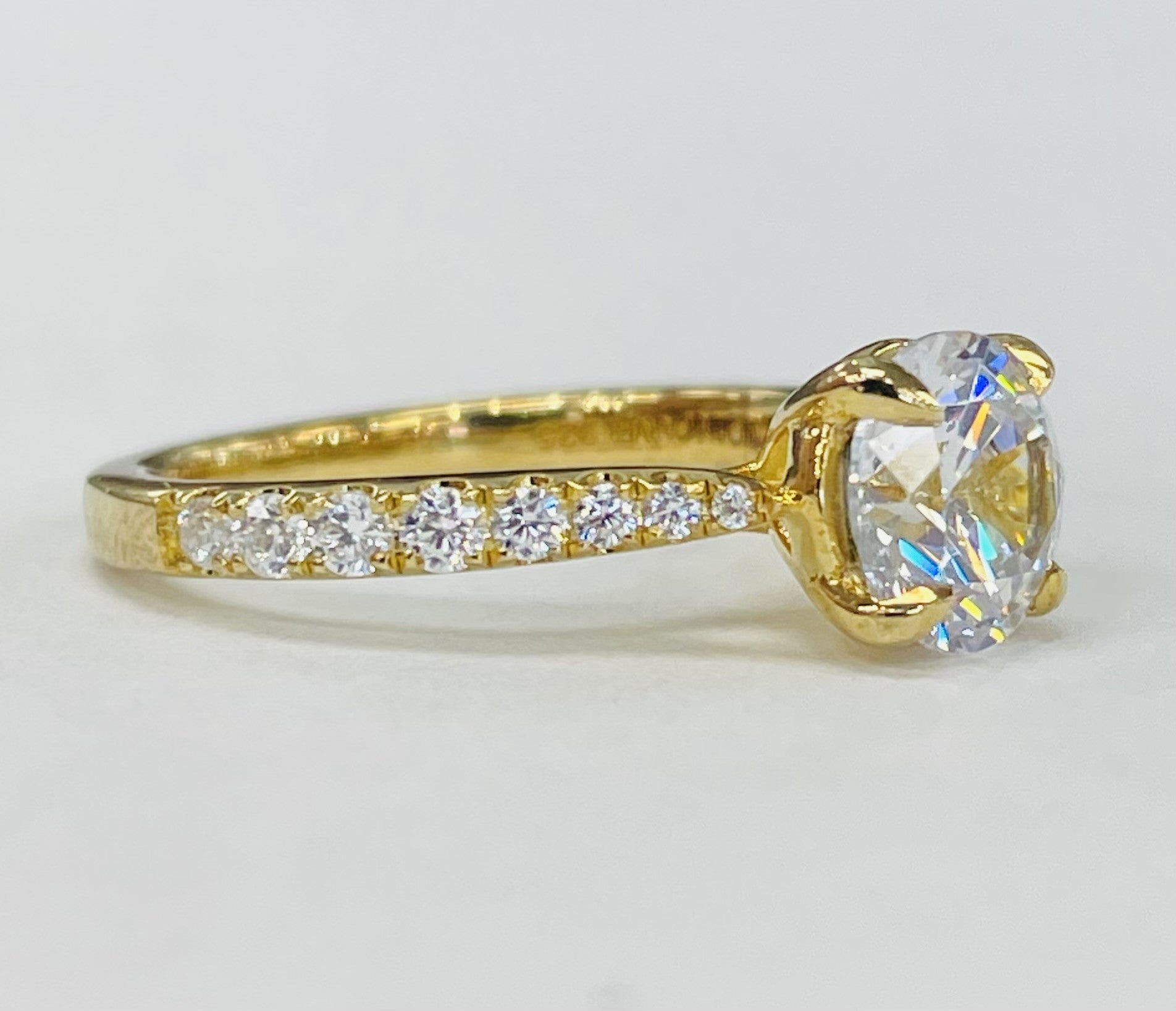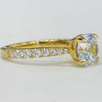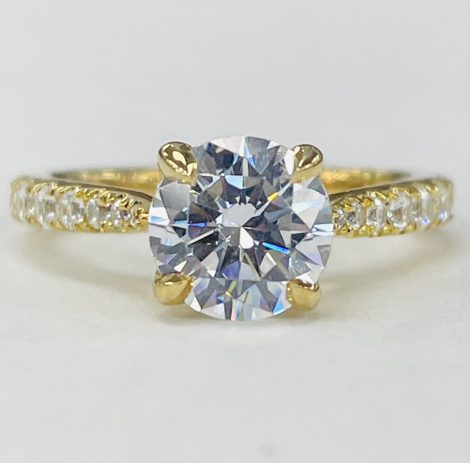 A simple yet elegant design. This setting features a four claw prong head. Accented by a tapered shank with a plethra of round brilliant diamonds. A setting she can wear with pride that will last through time.