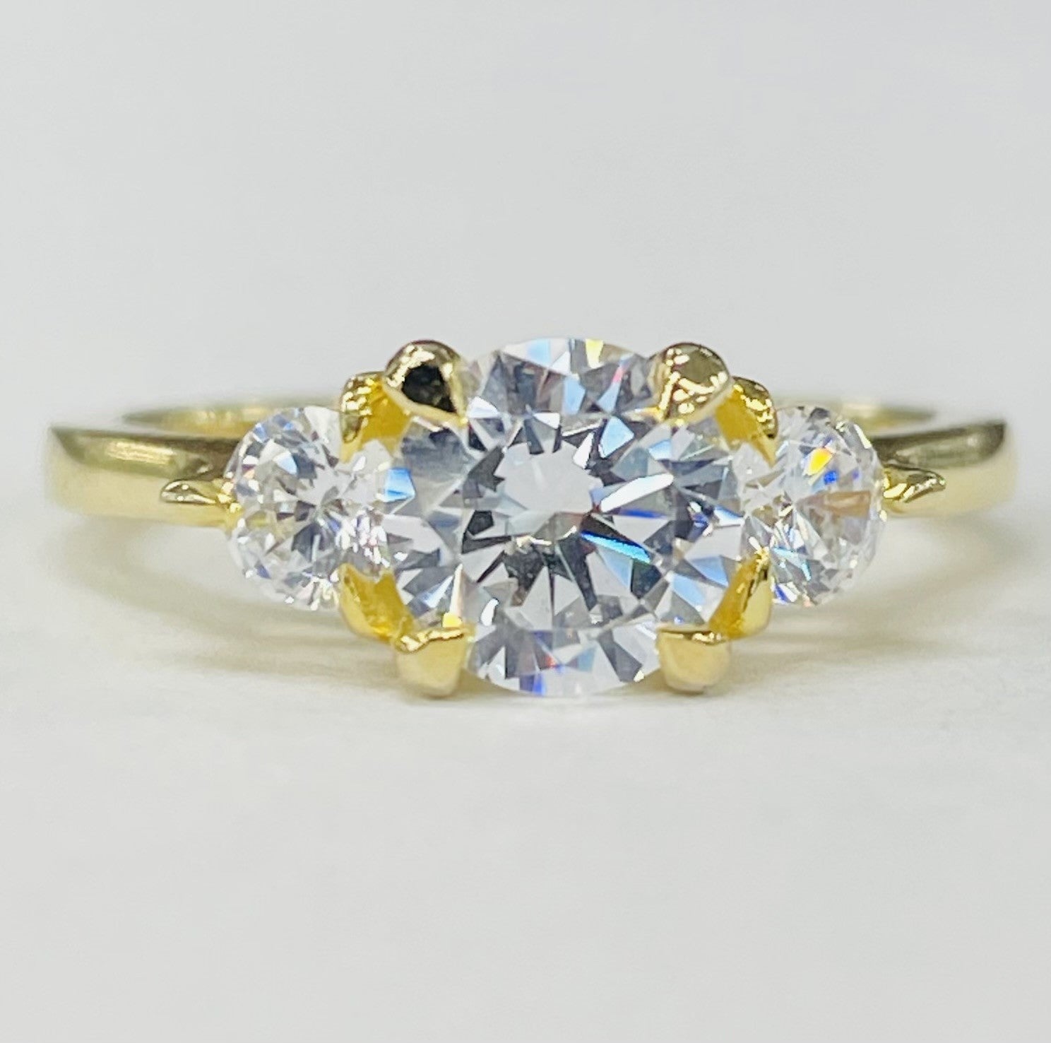 • Design: Three-stone solitaire with sculptural prong setting