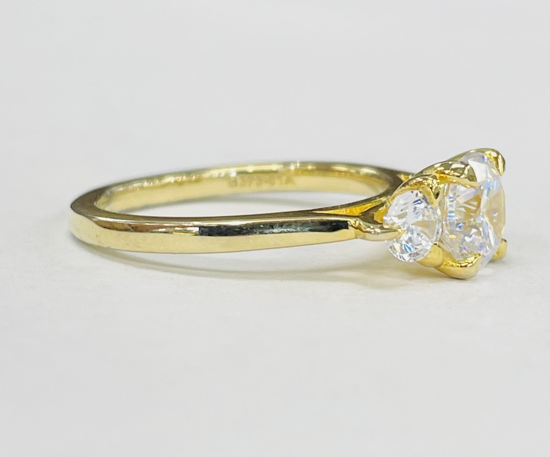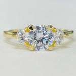 A classic design. This yellow gold setting features a round brilliant diamond on each side of your center stone. Accented by a plain shank and claw prongs to show off your center stone even more.