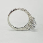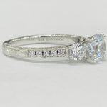 A timeless setting with a vintage feel. Made out of white gold this ring features two prominent diamonds to compliment your center stone. Accented by small round brilliant diamonds down the sides and a vintage style filigree. A true statement ring to show her how much she means to you.