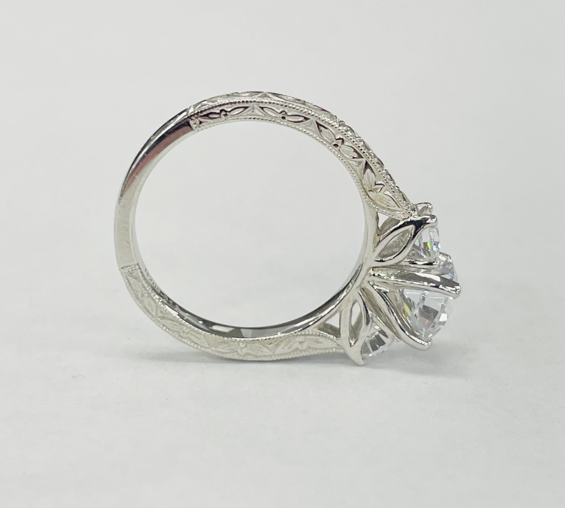 • Design: Hand-engraved three-stone setting with vintage-inspired craftsmanship