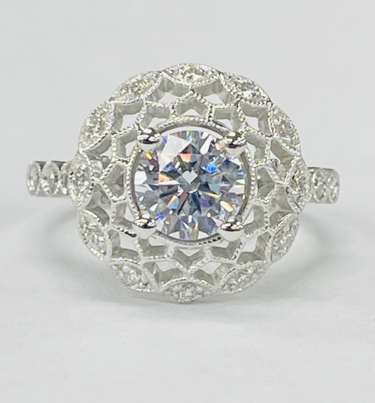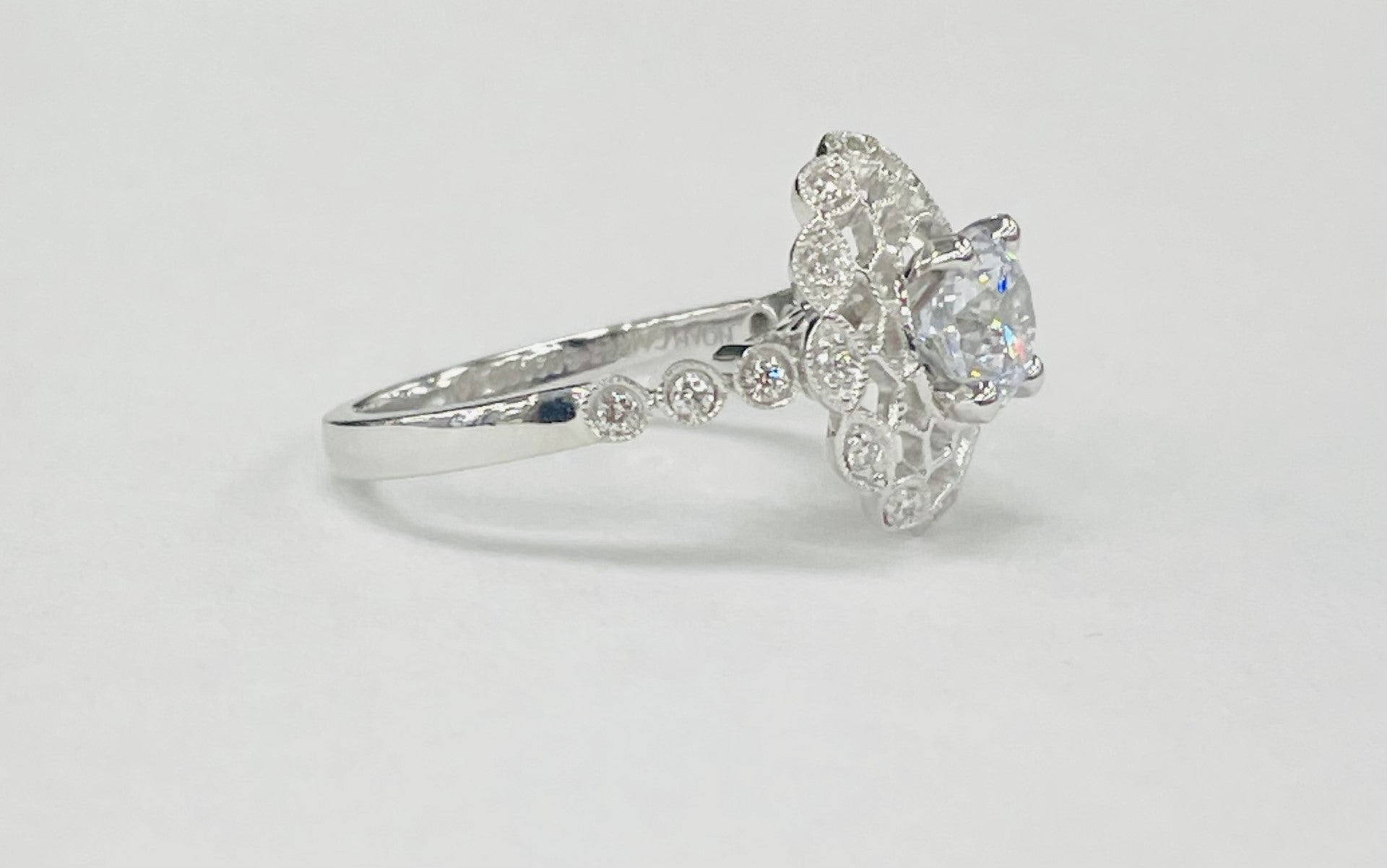 A vintage inspired setting with alot of character. Made to not only focus the eyes on your stunning center stone but also add contrast and give your stone a bigger look. Truly made for any vintage lover.
