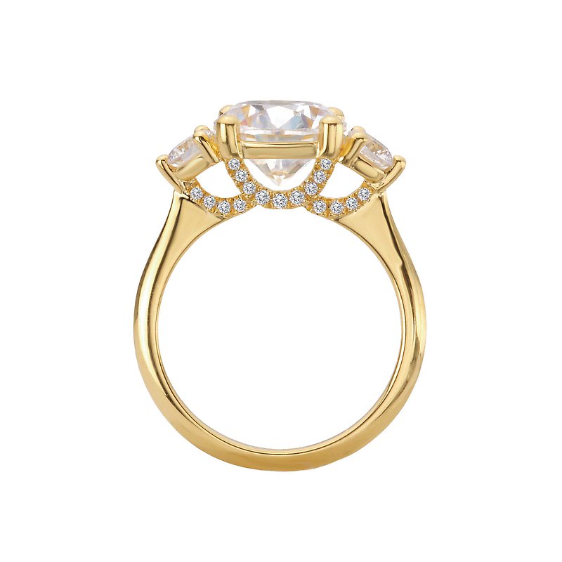 - Accent Diamonds: Two round diamonds flanking the center setting, 1/2 carat total weight