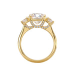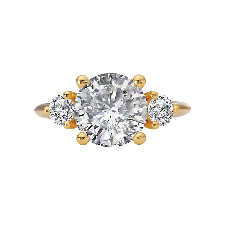 3-stone semi-mount engagement ring is set in 14kt yellow gold with two round diamonds along side a center setting that will accommodate a 9mm round diamond. (D 1/2 carat total weight)