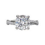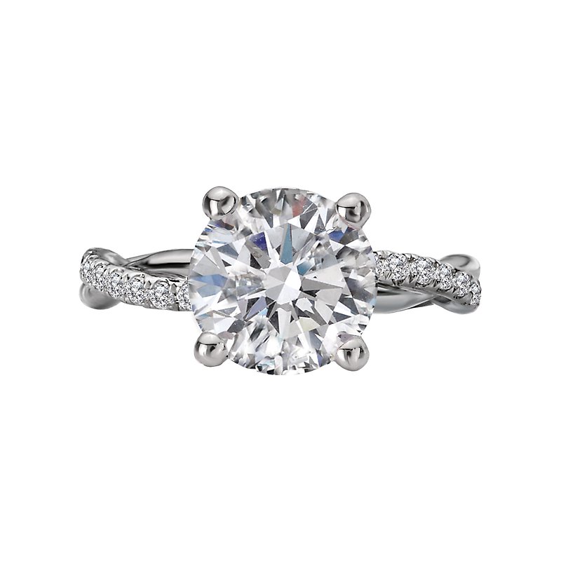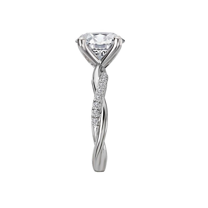 This is a beautiful semi-mount engagement ring features a band crafted of twisted 14kt white gold and diamonds that showcase a setting that will accommodate a round 8.2mm diamond. (D1/5 carat total weight)