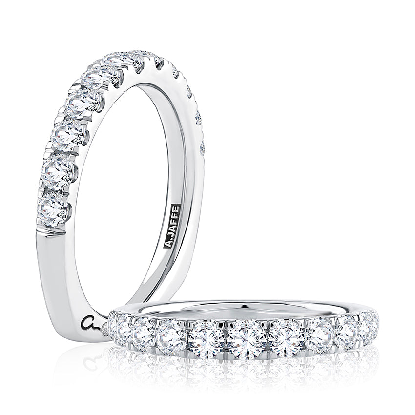 From the Metropolitan collection comes this Sophisticated Pavé Diamond Wedding Band designed to WOW and to woe. The wedding band shines bright with large pavé diamonds half way around for a total weight of 0.83 carats. Whether it is worn alone or with a matching engagement ring, this stunning dimaond wedding band is sure to make a statement.