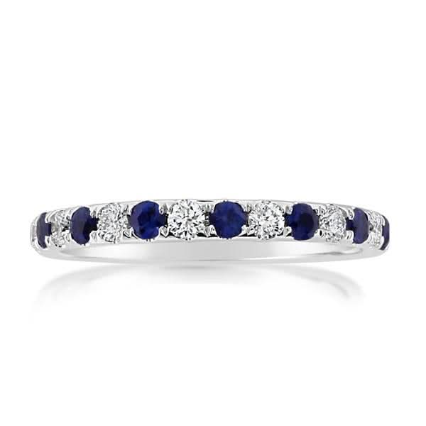 14K white gold sapphire and diamond band from the Reis-Nichols Collection. The band features eight round sapphires weighing .27 ctw and seven round brilliant cut diamonds weighing .24 ctw. Size 6 in stock now. Special order sizes also available. Visit either our Indianapolis/Fashion Mall Commons or Greenwood store to view our entire collection of sapphire rings.