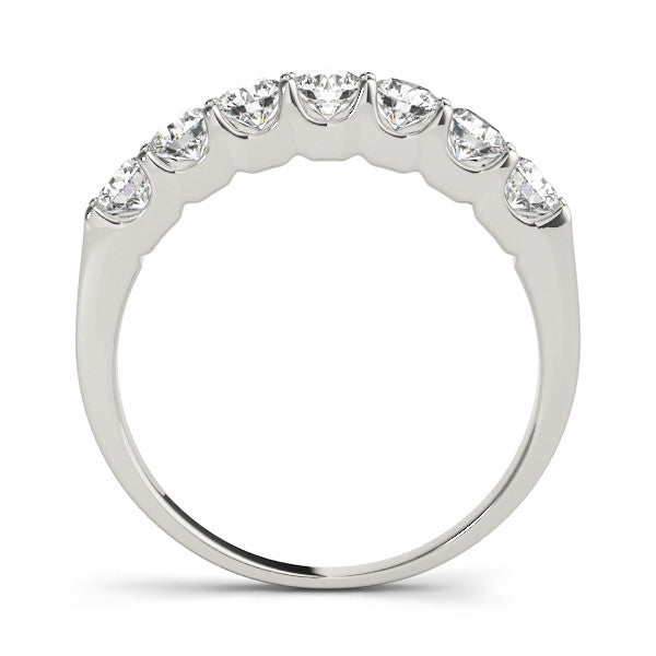 Made with sparkle in mind, this beautiful seven stone diamond wedding band is perfect to show off all the diamonds. With light coming in from the sides of the diamond this ring is great for an anniversary or for your wedding day!