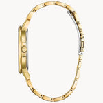 Axiom's refined yet sleek design offers a day-to-night fashion options for the avid trendsetter. A watch with Eco-Drive technology, not just a solar watch but powered by any light, featuring a men's gold-tone stainless steel case and bracelet with a champagne dial and the intriguing feature of edge-to-edge glass. Caliber number E031.