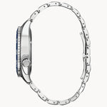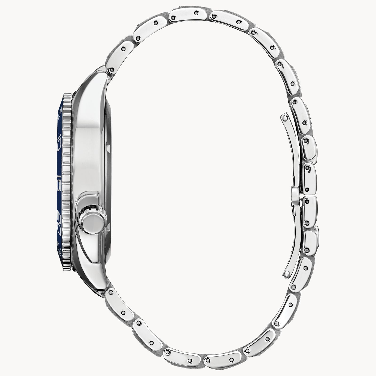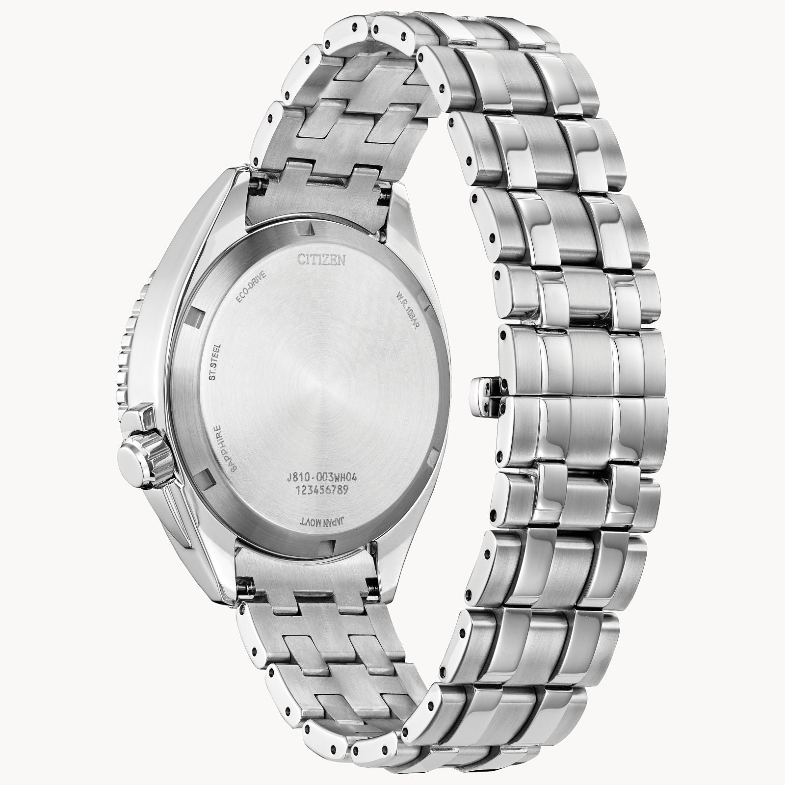 Our newest addition to the Sport Luxury collection gives a stylish update to a luxury men’s timepiece. Designed to be versatile yet elevated featuring a silver-tone stainless steel case and bracelet with a bold blue metal bezel 3-hand dial encased in sapphire crystal, date function, and a deployment clasp with push buttons for easy accessibility. Water resistant to 100 meters and sustainably powered by light with Eco-Drive that never needs a battery. Caliber number J810.