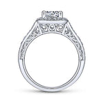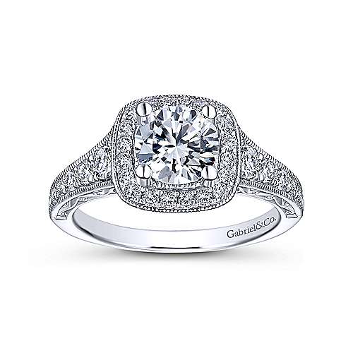 The Gabriel & Co. ER7293W44JJ Engagement Ring is a vintage-inspired treasure crafted in 14K white gold. This elegant design features a cushion-shaped halo surrounding a round center stone, with intricate scrollwork beneath the gallery for added sophistication. Graduated diamond columns taper along the reverse shank, creating a refined silhouette. With 0.56 carats of accent diamonds, this setting blends Victorian charm with modern craftsmanship, making it the perfect choice for brides who love timeless romance.