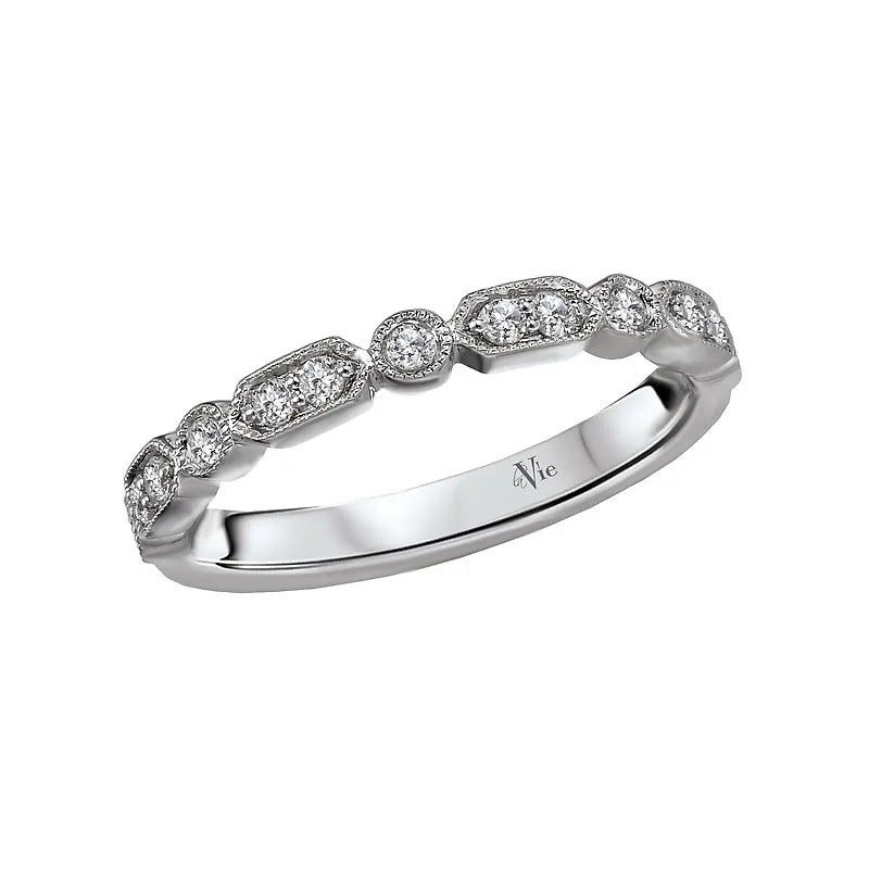 A timeless 14K white gold wedding band adorned with 1/5ct of round diamonds and vintage-inspired milgrain detail.
