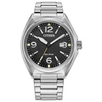 With a sporty look and feel, this Citizen Men's Sport is great for everyday wear.375 Styled in stainless steel with a black dial and silver-tone markers. 12, 3, 6 and 9 o'clock are oversized for an easy-to-read yet stylish look. Date display appears at the 3 o'clock position. Powered by any light with Citizen Eco-Drive technology.