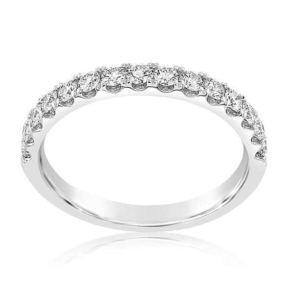 14K white gold diamond wedding band from the Reis-Nichols Collection. The band features 15 round brilliant cut diamonds weighing .50 ctw. Size 6.5 in stock now. Special order sizes also available. Pricing may vary with size of ring.