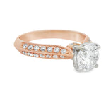 This stunning rose gold engagement ring features a brilliant round diamond at its center, surrounded by a delicate band adorned with smaller sparkling stones. Its timeless design makes it the perfect symbol of love and commitment, ideal for that special moment.