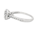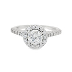 This stunning diamond halo engagement ring features a brilliant center stone surrounded by a circle of smaller diamonds, creating a captivating sparkle. The delicate band is adorned with additional diamonds, ensuring that this piece shines from every angle. Perfect for making a memorable proposal or celebrating a special occasion.