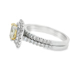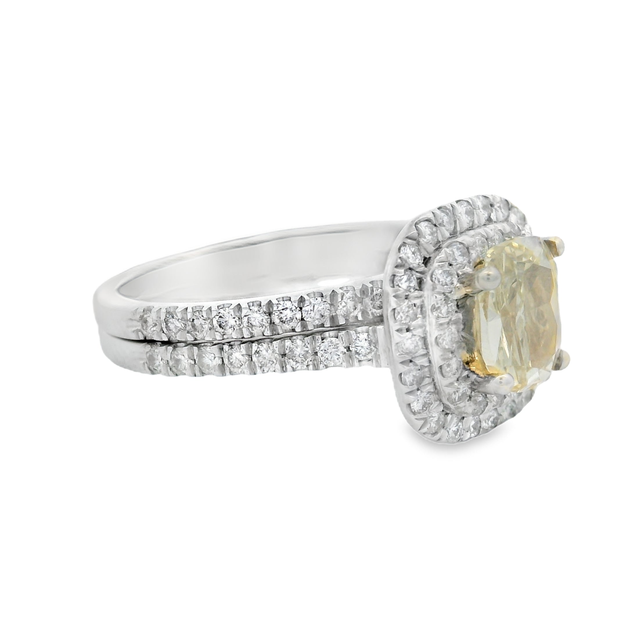 A stunning ring with a splah of color. Made out of luxurious 18KT white gold, this ring features a prominate 1CT yellow oval diamond. Accented by a plethra of diamonds within the double halo and more down the sides. Showing the true meaning of love and compassion with a pop of color is perfect for any proposal, anniversary, or special ocassion.